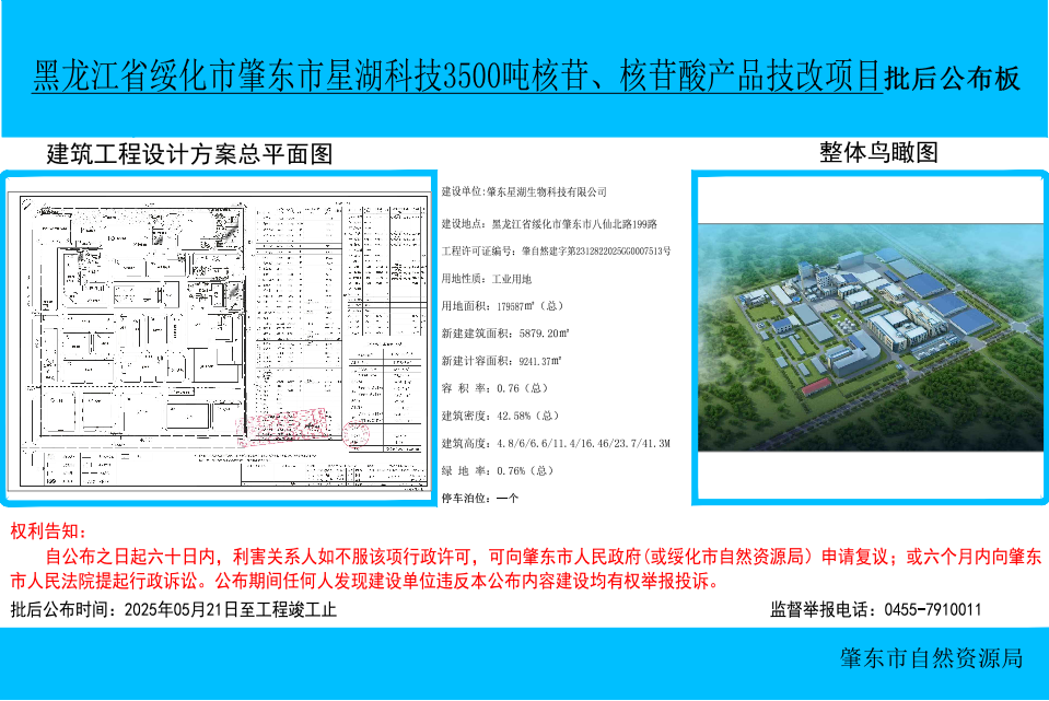 黑龙江省绥化市肇东市星湖科技3500吨核苷、核苷酸产品技改项目批后公布板
