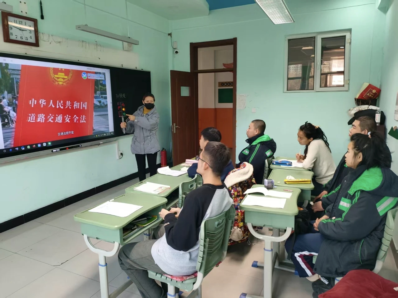 此次活动聚焦家校协同,凸显教育实效。课堂伊始,老师便强调家长作为孩子安全第一守护者的责任,明确交通安全教育需家校携手推进。活动现场座无虚席,同学们端坐专注,家长们认真聆听,共同投入安全知识学习。结合特殊学生认知特点,学校摒弃复杂理论,采用“图片+案例+互动”模式设计教学内容:大屏幕上,色彩鲜明的交通标志卡通图搭配趣味解说,直观呈现红绿灯、斑马线等核心标识;真实交通事故案例以通俗语言拆解,重点剖析步行、乘车中的安全隐患,让师生及家长深刻认识到遵守交通规则的重要性。同时,结合学生日常出行场景,细致梳理“过马路一停二看三通过”“骑电动车全员戴头盔”“拒绝超员车黑车”等安全要点,实用内容获得家长们一致认可。